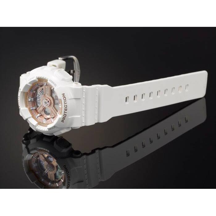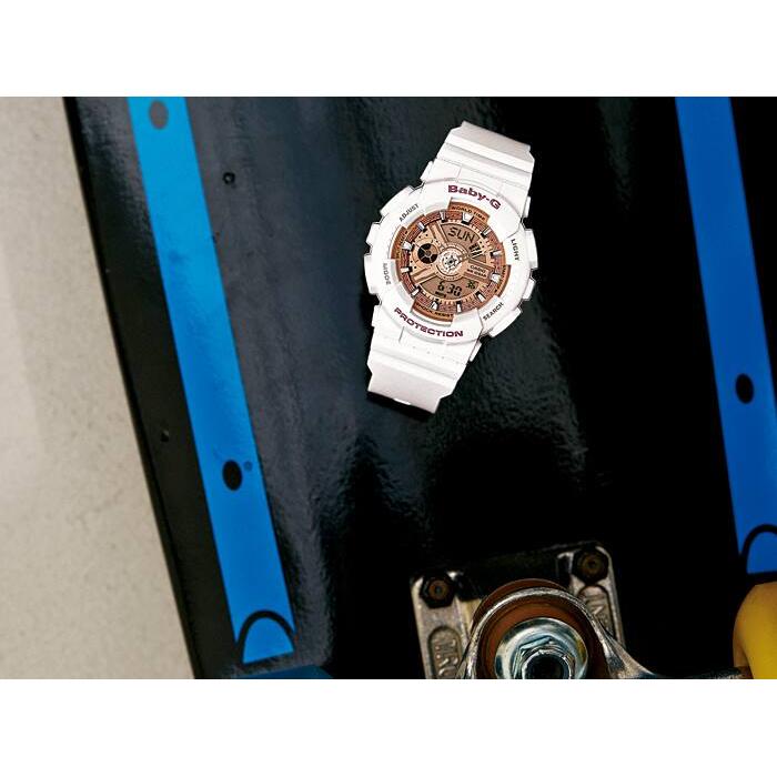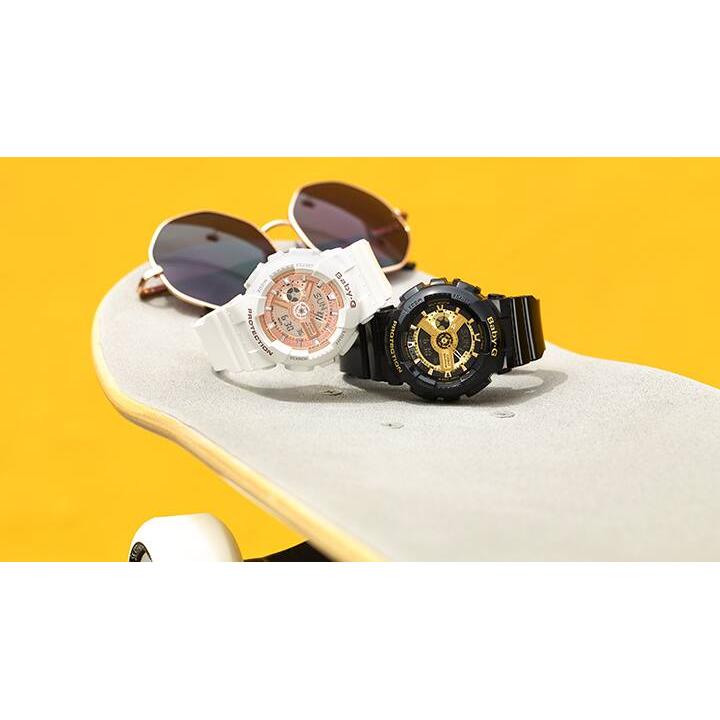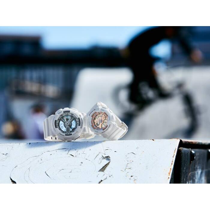 G-SHOCK 빅 케이스 시리즈의 인기 모델인 GA-110의 디자인에서 영감을 받은 모델입니다. GA-110은 다이얼과 인덱스 등 다양한 파트를 복잡하게 결합했습니다. 기어에서 영감을 받은 파트와 3차원 다이얼이 복잡하고 기계적인 느낌을 줍니다. 이 모델은 G-SHOCK의 쿨함을 유지하면서도 여성스러운 손목에 맞게 작고 얇습니다. 3차원으로 배열된 인덱스는 반짝이는 메탈릭 코팅으로 세련된 질감을 더했습니다. 이를 통해 시계에 날카롭고 활기찬 느낌을 줍니다. 사이드 버튼은 누르기 쉽게 만들어져 더욱 실용적입니다. 개성을 부여하고 스트리트 패션계에서 멋지게 보이는 복잡한 기계식 다이얼이 있는 시계인 BABY-G.